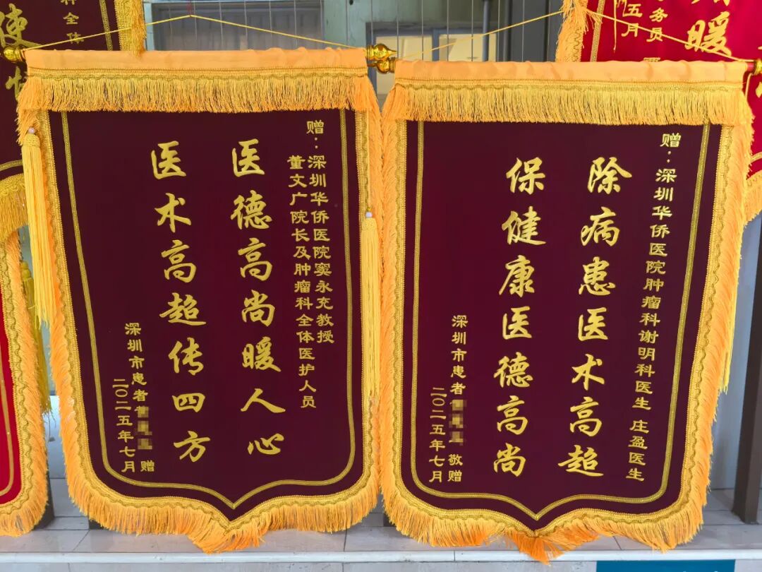 满怀感恩之心的黄阿姨,特地送来两面锦旗,“医德高尚暖人心,医术高超传四方”“除病患医术高超,保健康医德高尚”,盛赞深圳华侨医院肿瘤科专家团队。不仅如此,她还亲自撰文,希望登在华侨报上,希望更多病人了解深圳华侨医院肿瘤中心的高超技术及贴心服务。这不仅是对专家团队医术的肯定,更是医患之间深厚情谊的见证。