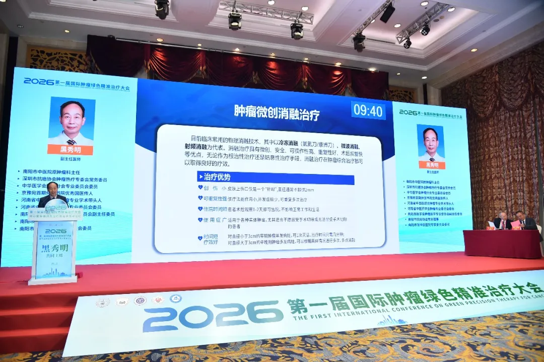 紧扣肿瘤绿色精准治疗“低损伤、高效能”核心议题,大会共同主席、中华医学会肿瘤分会专委会委员、深圳市抗癌协会肿瘤热疗专委会常委黑秀明在课题演讲中聚焦微创消融术的临床应用,强调该技术通过超声或CT实时引导将消融针精准刺入肿瘤病灶,借助高温或超低温技术实现肿瘤细胞原位灭活,体表仅留针眼大小创口无需开胸开腹,可最大程度保留正常器官功能,避免传统手术对机体的过度损伤,尤其适合高龄、体弱及无法耐受传统放化疗的肿瘤患者,让更多患者在微创理念下获得高质量治疗选择。